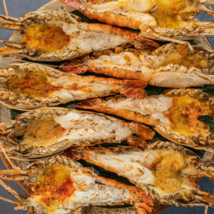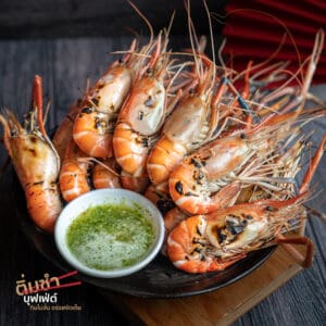 - กุ้งแม่น้ำตัวใหญ่ย่าง น้ำจิ้มซีฟู้ดและน้ำปลาหวาน