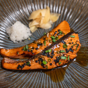 - ปลาเก๋าย่างน้ำแกงใบพริกหอมและไข่แซลม่อน